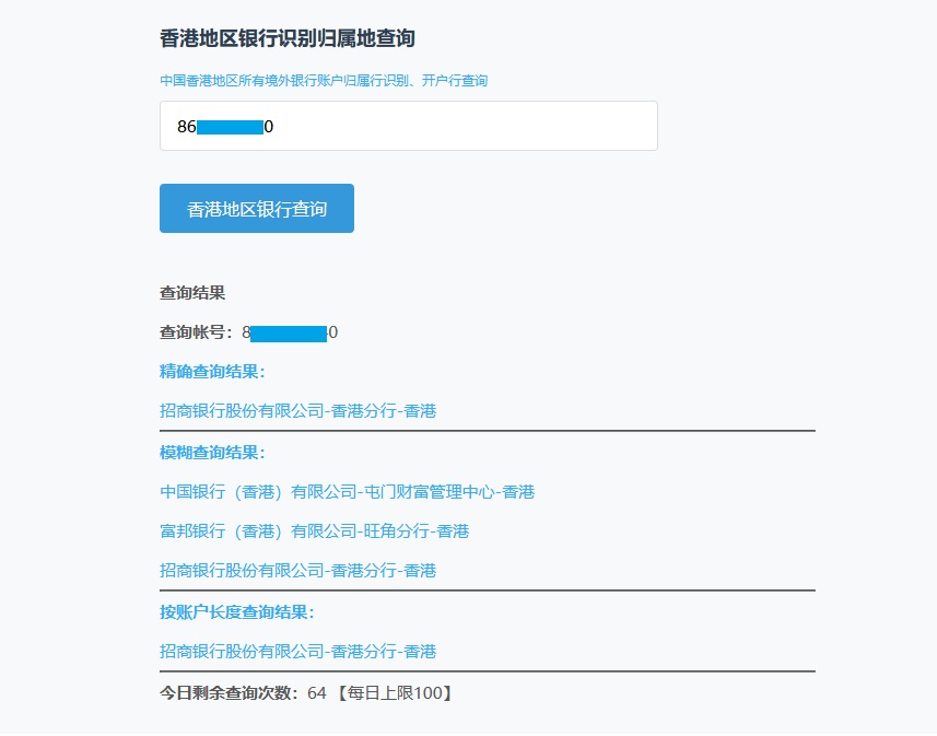 按账户长度查询支持的银行:中国银行(香港) 、中国建设银行(亚洲)、中国工商银行(亚洲)、浦发银行(香港)、交通银行(香港)、上海商业银行 、民生银行香港分行 、招商银行香港分行、恒生银行、汇丰银行、渣打银行、大新银行、招商永隆银行、星展银行、东亚银行、创兴银行、集友银行南洋商业银行、中信银行(国际)、花旗银行、华侨银行、众安银行
