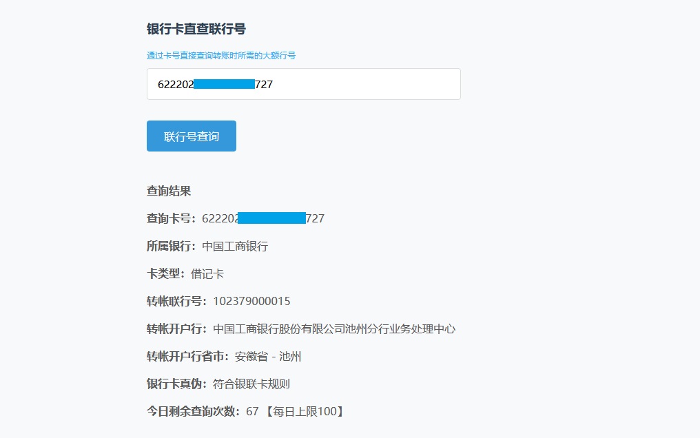 本系统查询收费 通过卡号直接查询转帐时所需的大额行号,行号对应的开户行名称,查询结果仅用于转帐,不能代表该卡的具体开户支行 银行卡号可以查询出该卡号的所属银行、卡类型、大额行号、行号对应的开户行名称、及开户行名称所在的省市归属地。 查询结果可能和实际结果并不相符,查询结果仅供参考。