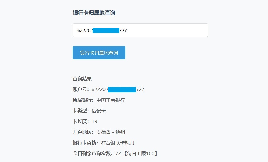 本系统查询收费 查询支持国内外4000+银行的银行卡识别、银行卡开户行归属地省市查询 银行卡号可以查询出该卡号的所属银行、卡种、卡类型、卡名称、银行官网、客服电话、开户行归属地省市。 查询结果可能和实际结果并不相符,查询结果仅供参考。